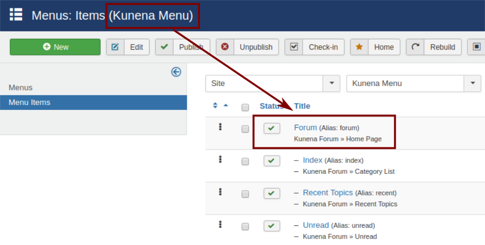 Step 1) Go to Menu Item Manager: Menus -> Kunena Menu and edit the menu item Forum