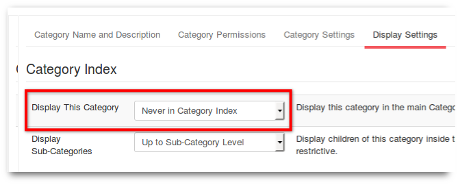 Settings are Display This Category = Never in Category Index and Display Sub-Categories = Up to Sub-Category Level