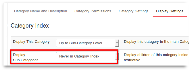 Settings are Display This Category = Up to Sub-Category Level and Display Sub-Categories = Never in Category Index